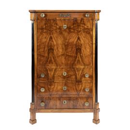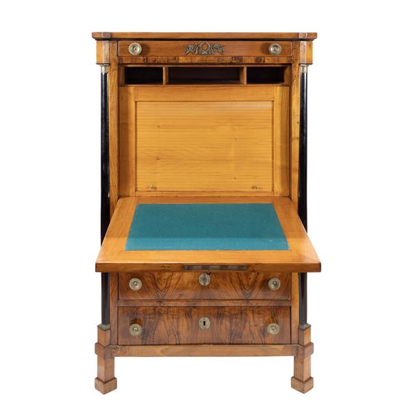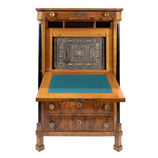 147x90x47 cm.upper part with a drawer, flap front with two ebonized wooden columns, internal metal safe, various drawers and compartments, lower part with three drawers, gilded bronze applications, wears and defects