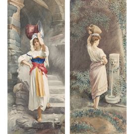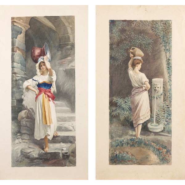 54.5x28.5 cm."Popolane", pair of watercolors on paper, signed lower left