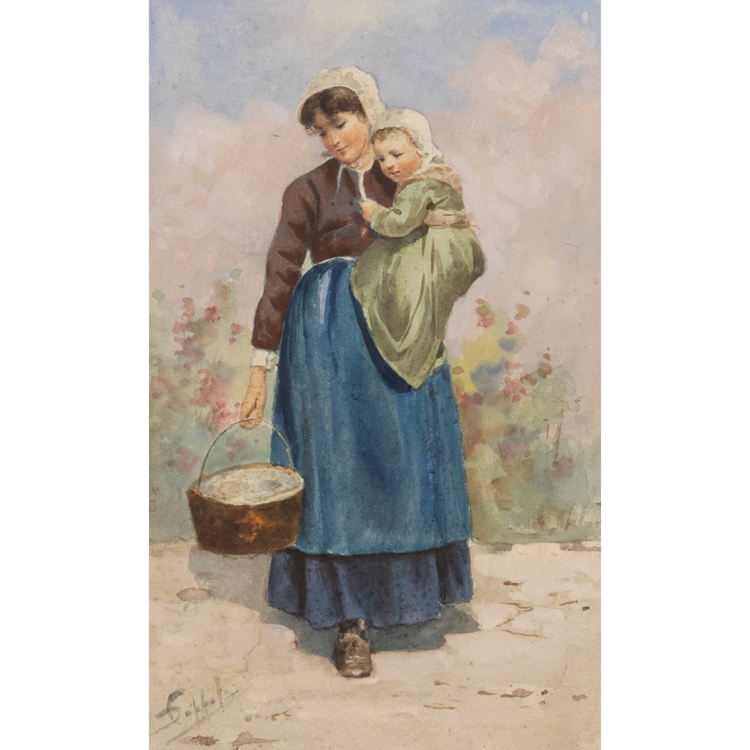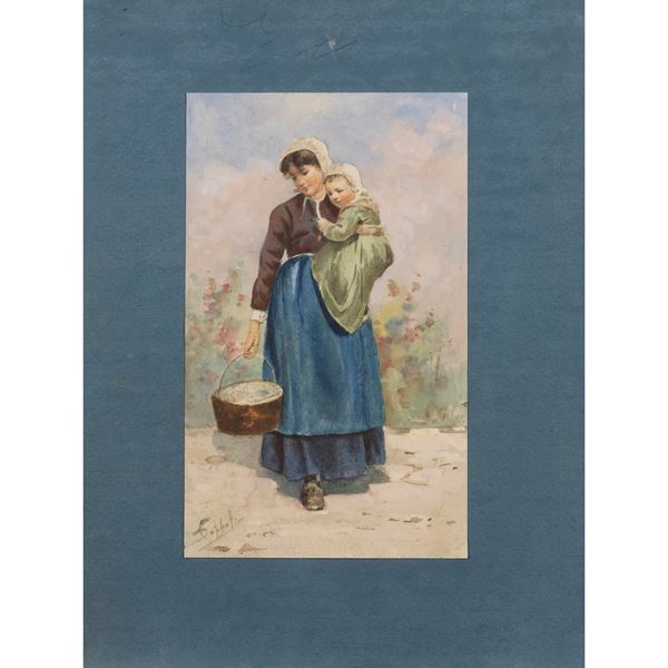 24x15 cm."Lady with little girl", watercolor on paper, signed lower left