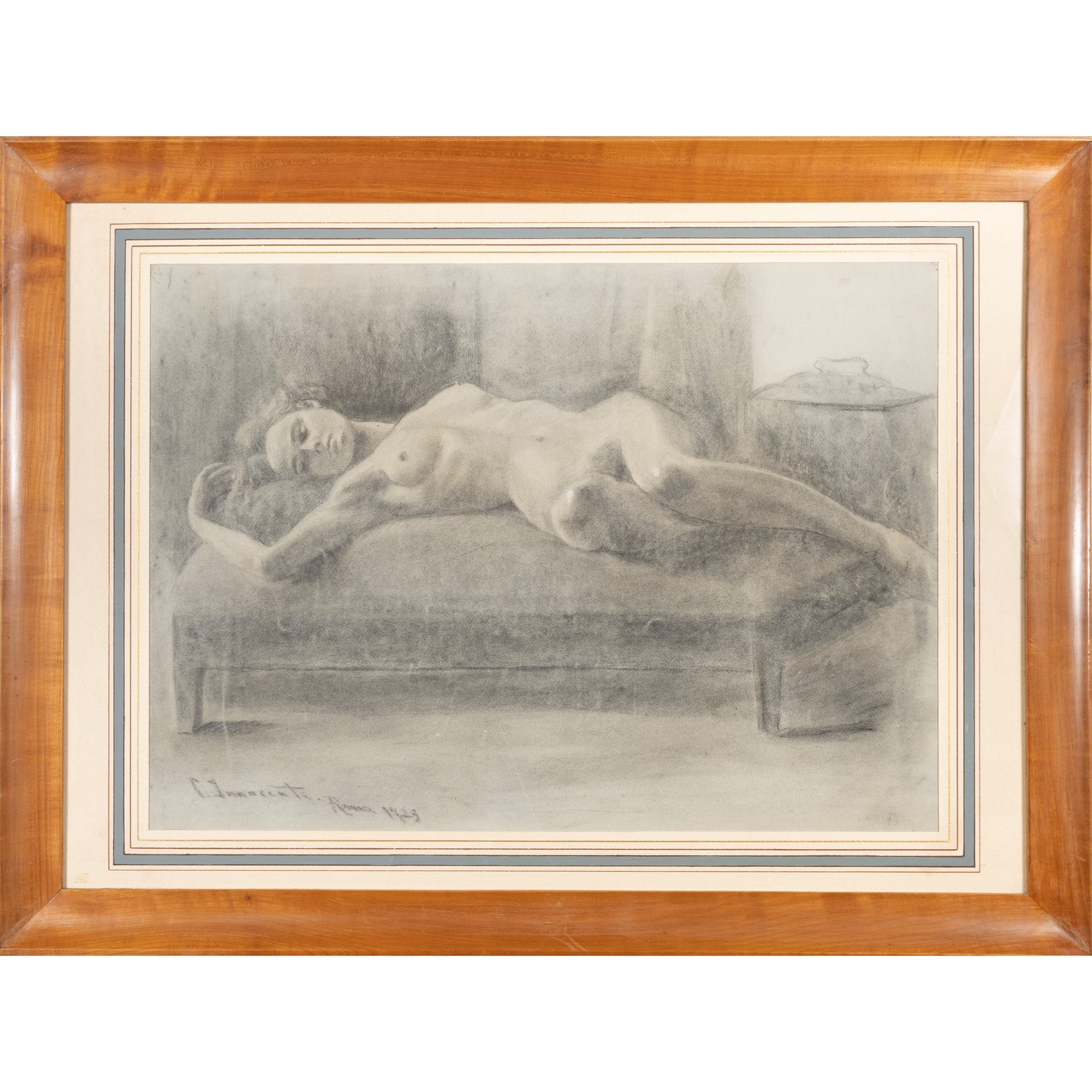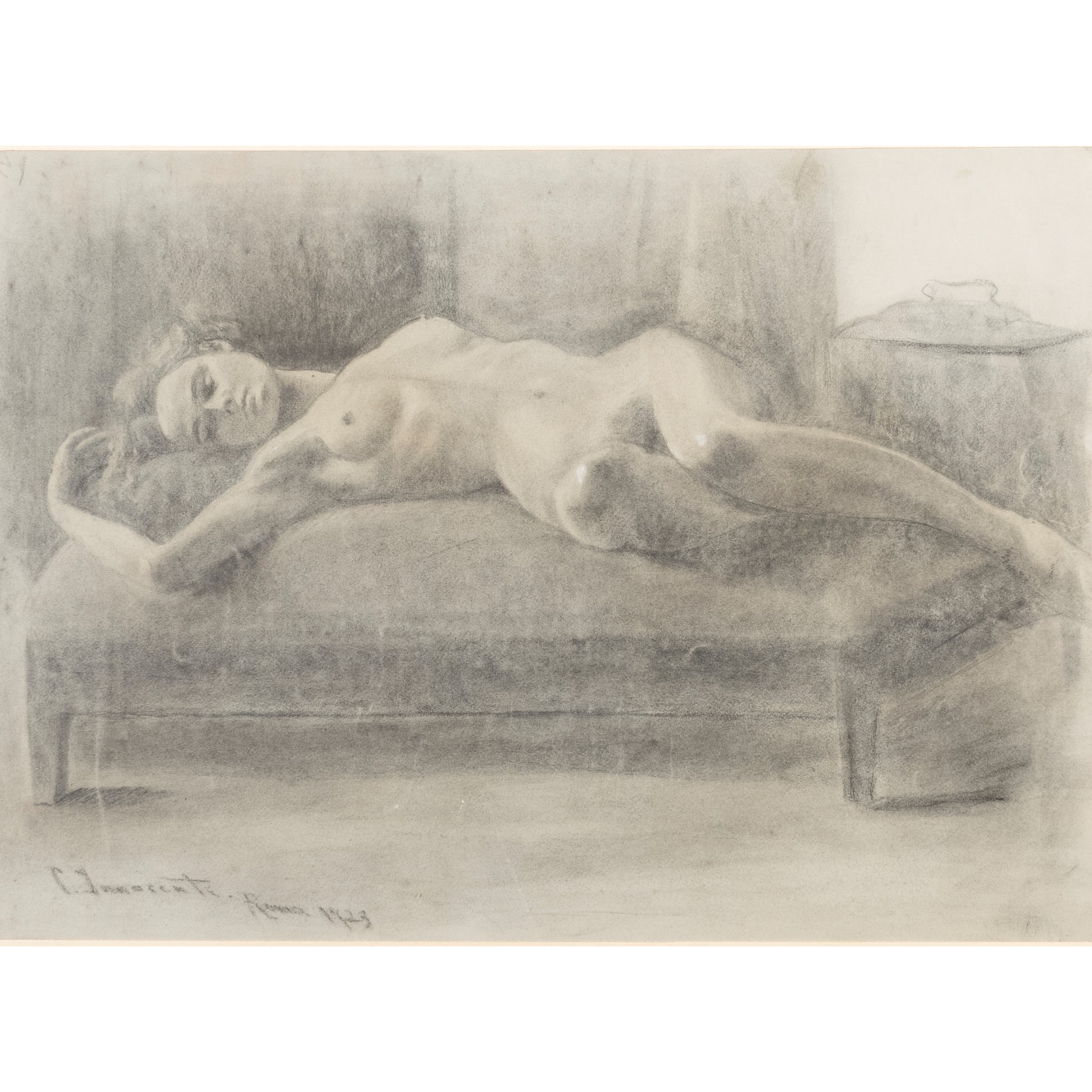 45.5x63.5 cm."Nudo disteso", 1923, charcoal and white lead on paper, signed and dated lower left, within frame