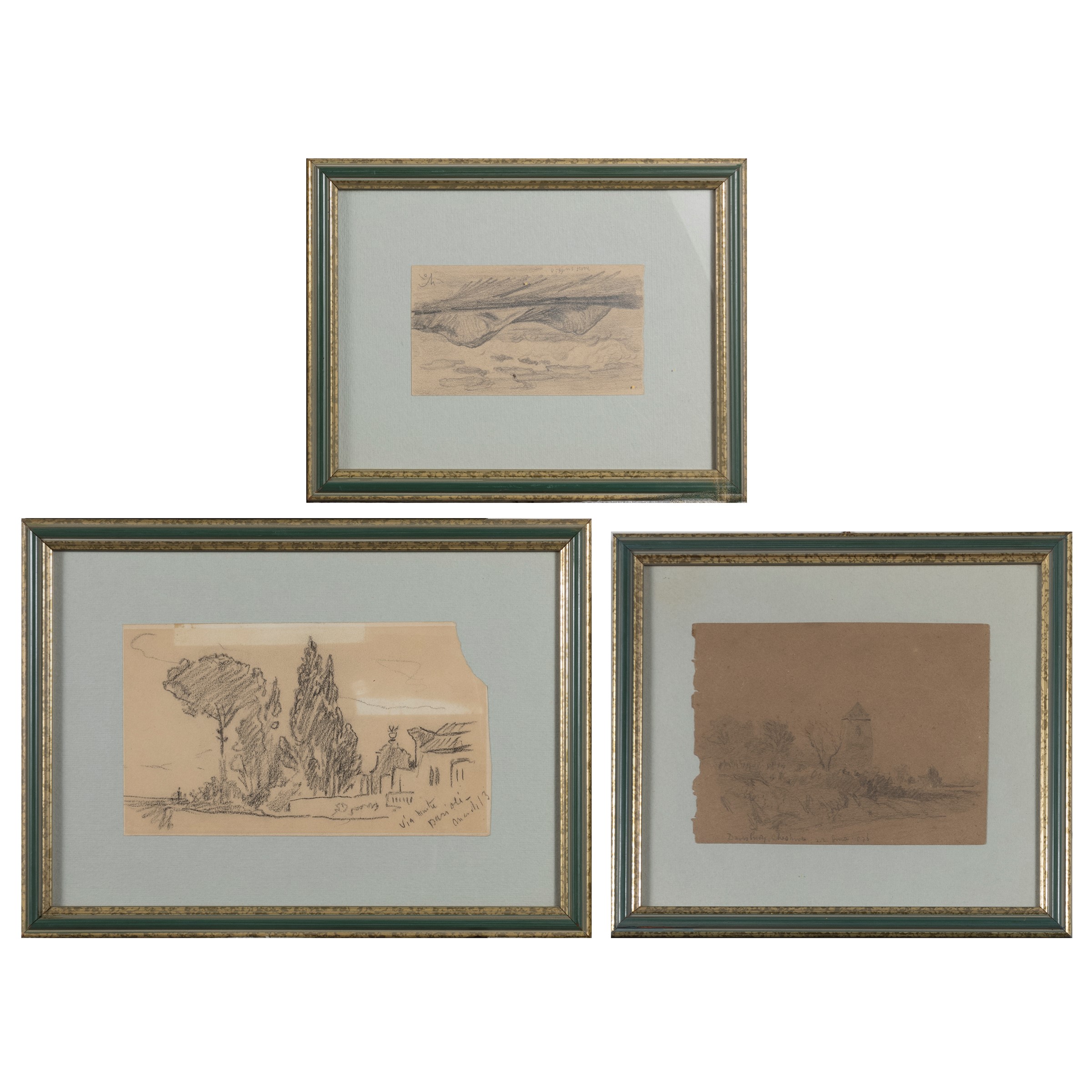 10x17.5 cm. - 10.5x14 cm. - 6x11 cm."Vedute", three pencil and charcoal drawings on paper, one signed lower right, within frames