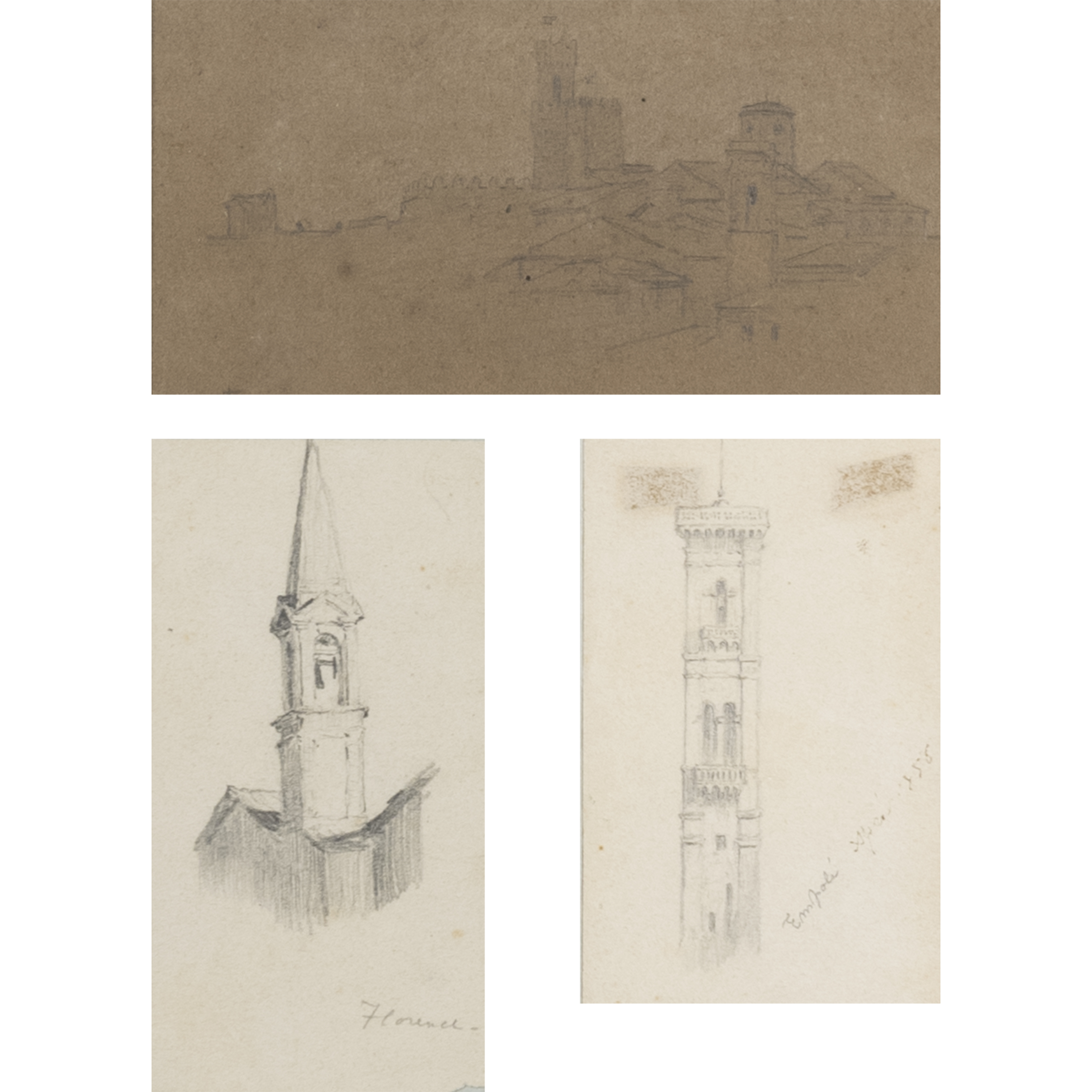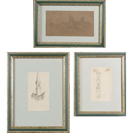 8.5x5.5cm. - 8.5x5.5cm. - 6.5x12 cm."Tuscan Architecture", three pencil and charcoal drawings on paper, signed lower right, within frames