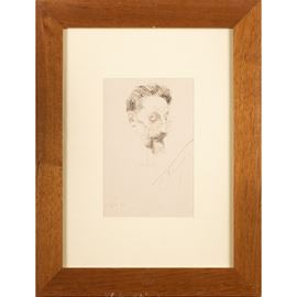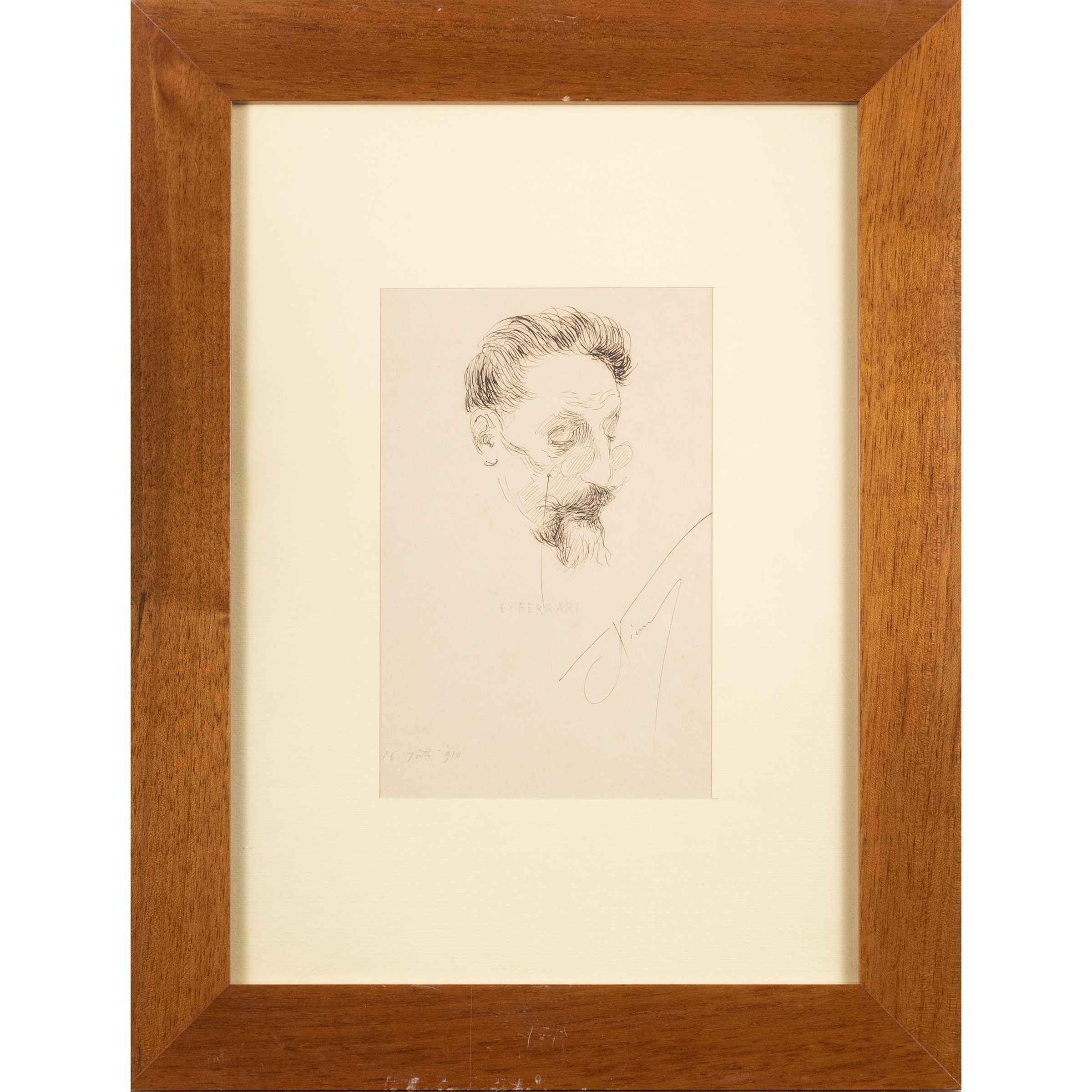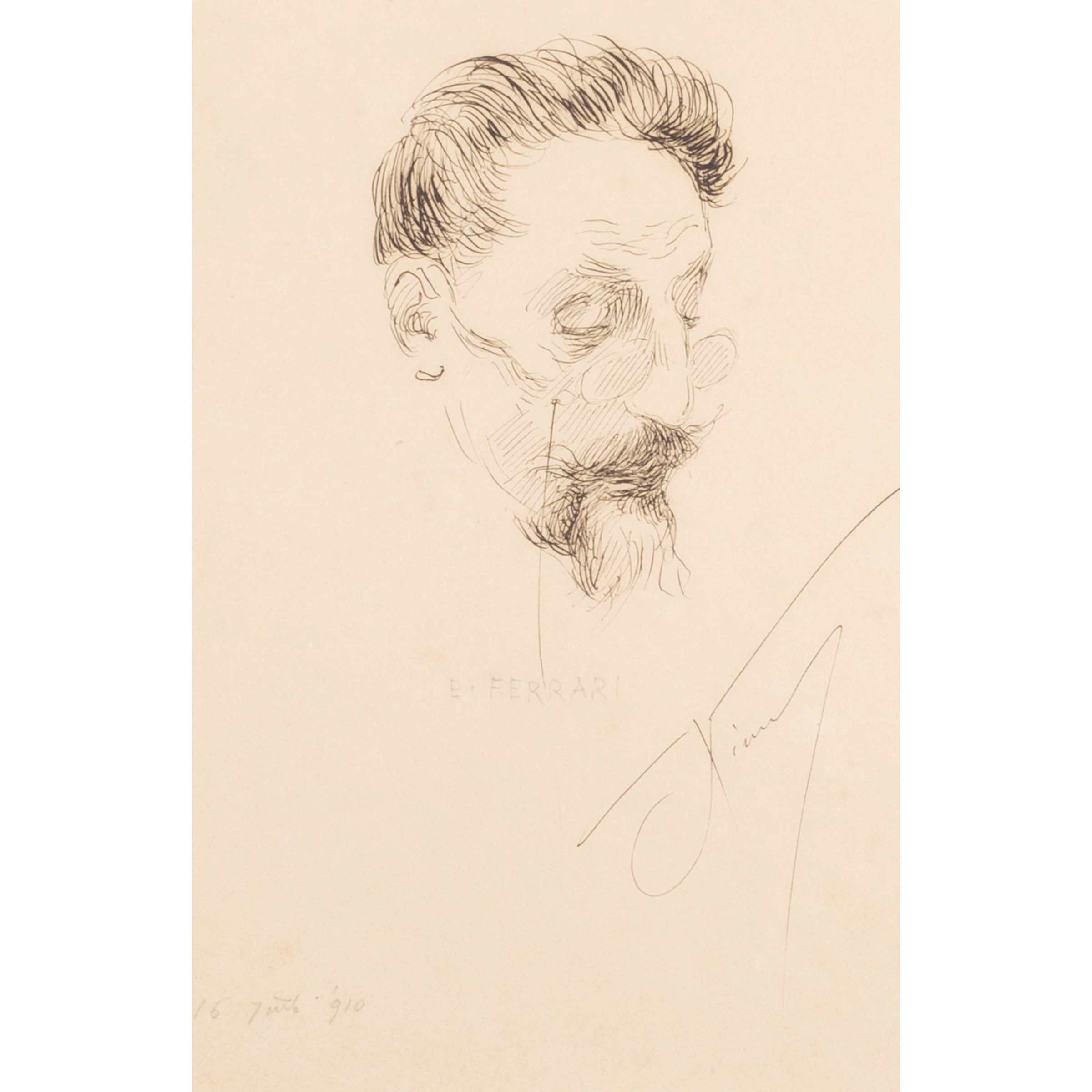 19.5x13 cm."Portrait of Ettore Ferrari", 1910, Indian ink on paper, signed lower right, dated lower left, within frame
