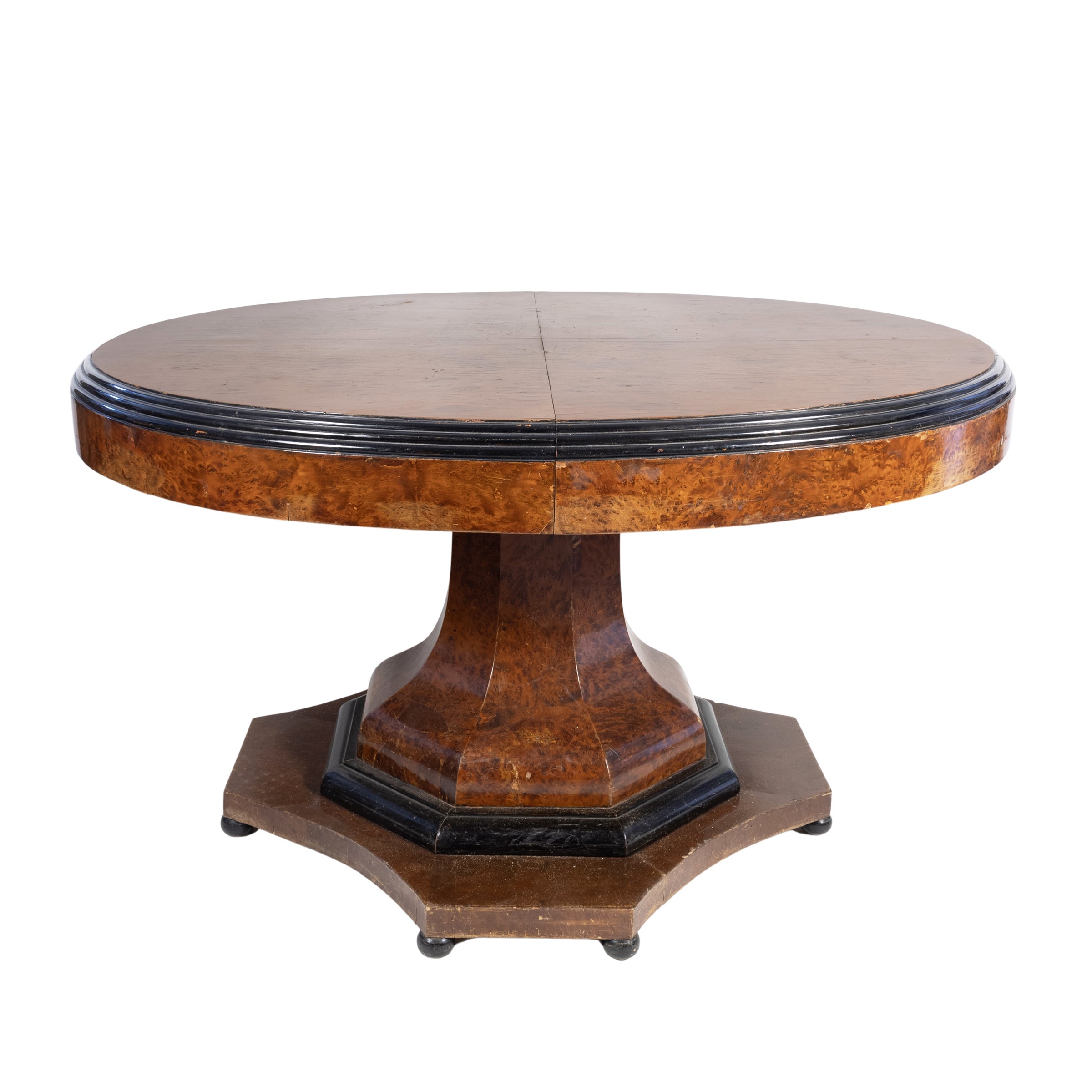 77x118x136 cm.oval top and rounded band, resting on a tapered polygonal column support, on a shaped base with ball feet, wears and losses. Complete with two irrelevant extensions, respectively 50 cm and 30 cm.
