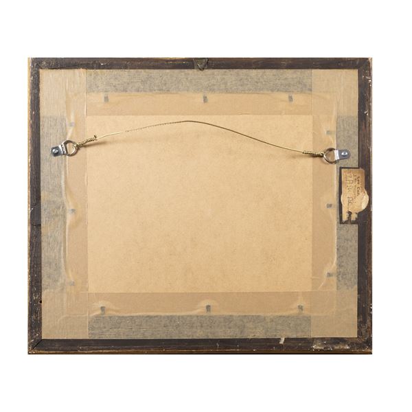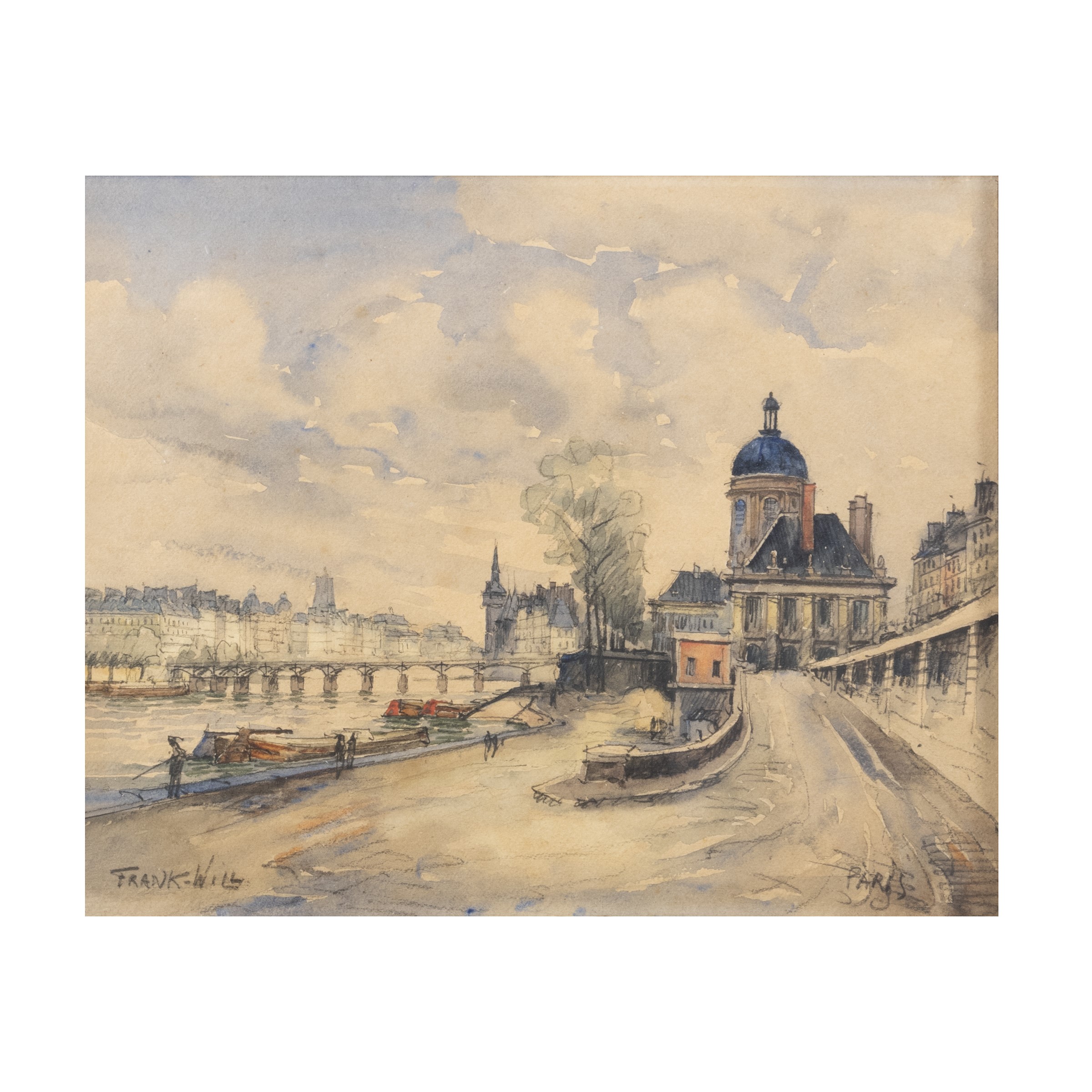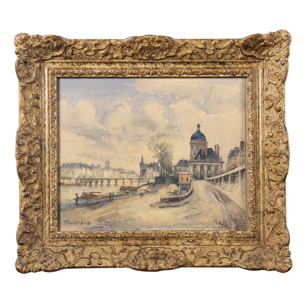 22x27 cm."Glimpse of Paris with the Seine", mixed media on paper, signed lower left, within a frame