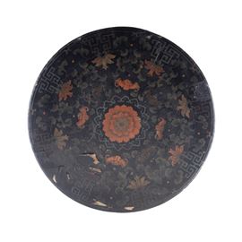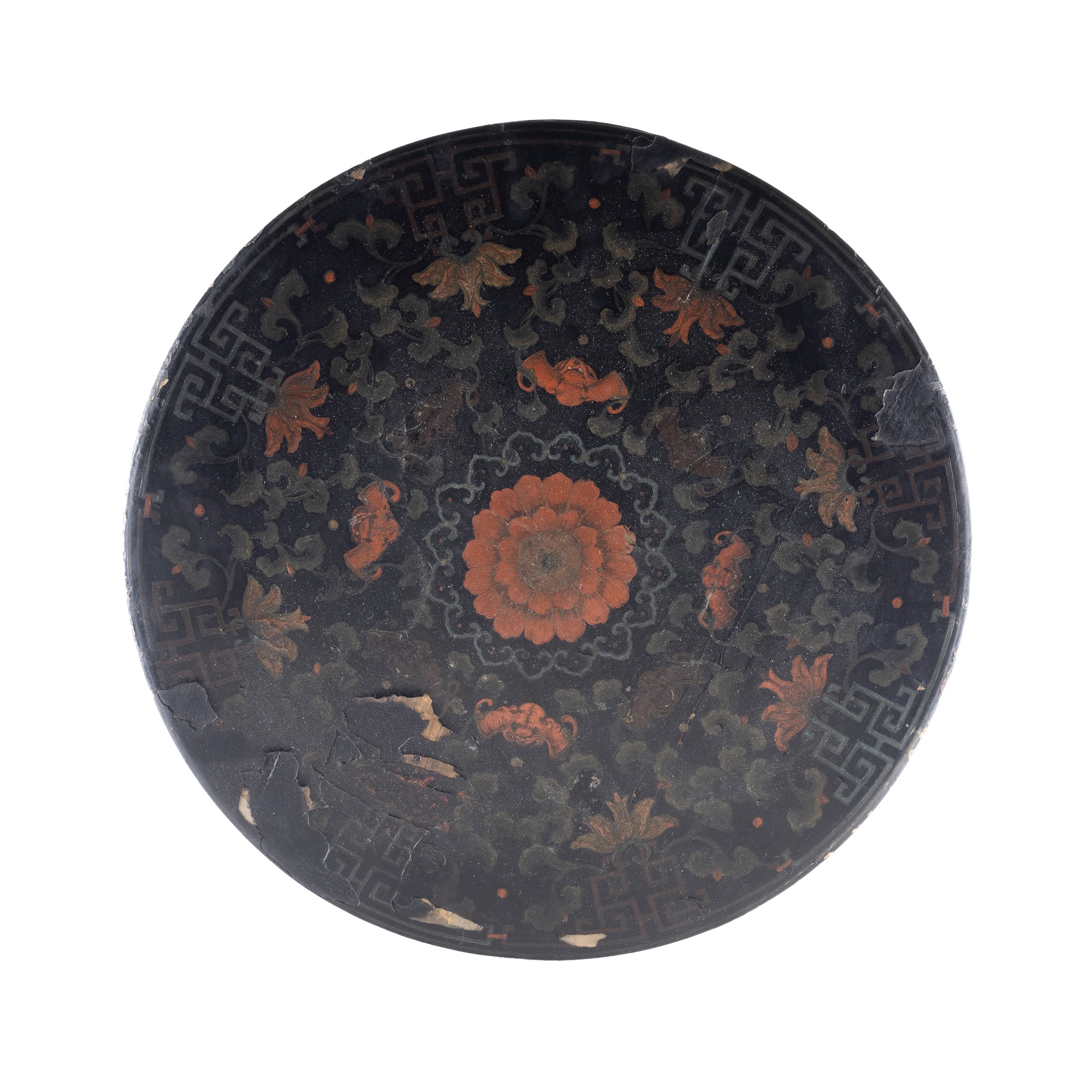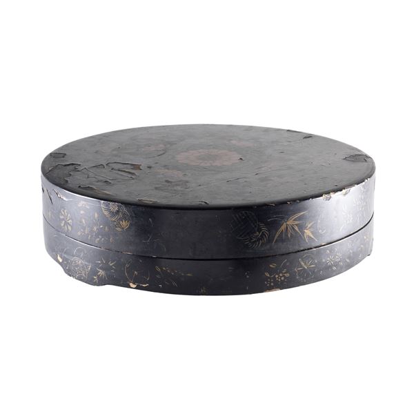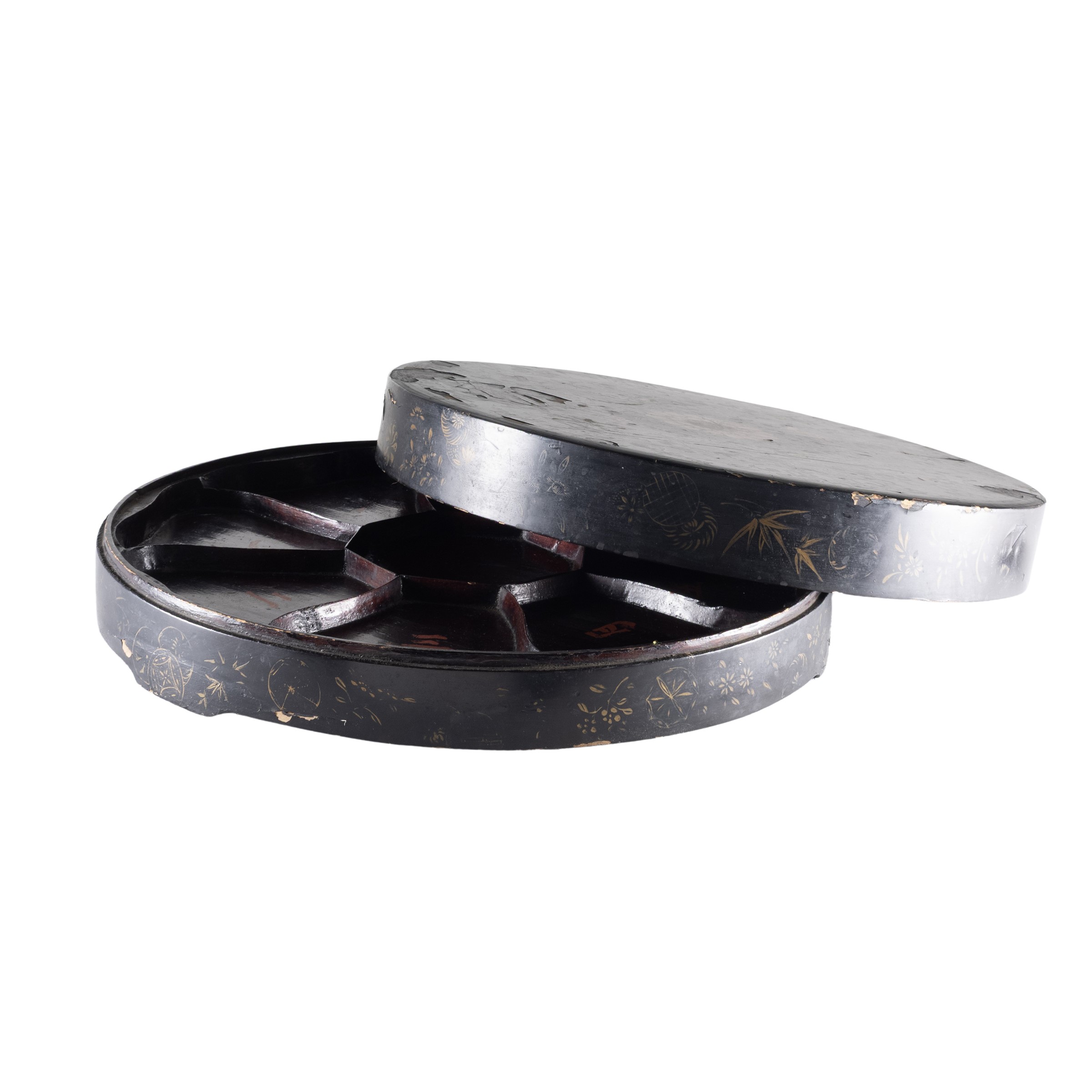 11x44.5 cm.circular shape, lid decorated in polychrome with floral motifs and symbols, interior with compartments, wears