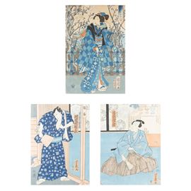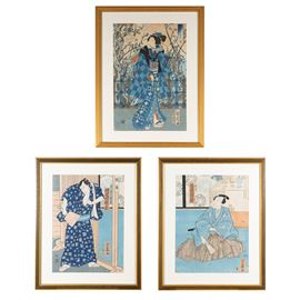 36x25 cm. - 32x24 cm."Kabuki theater characters with identifying scrolls", three color woodcuts on paper, publisher's mark, within frames