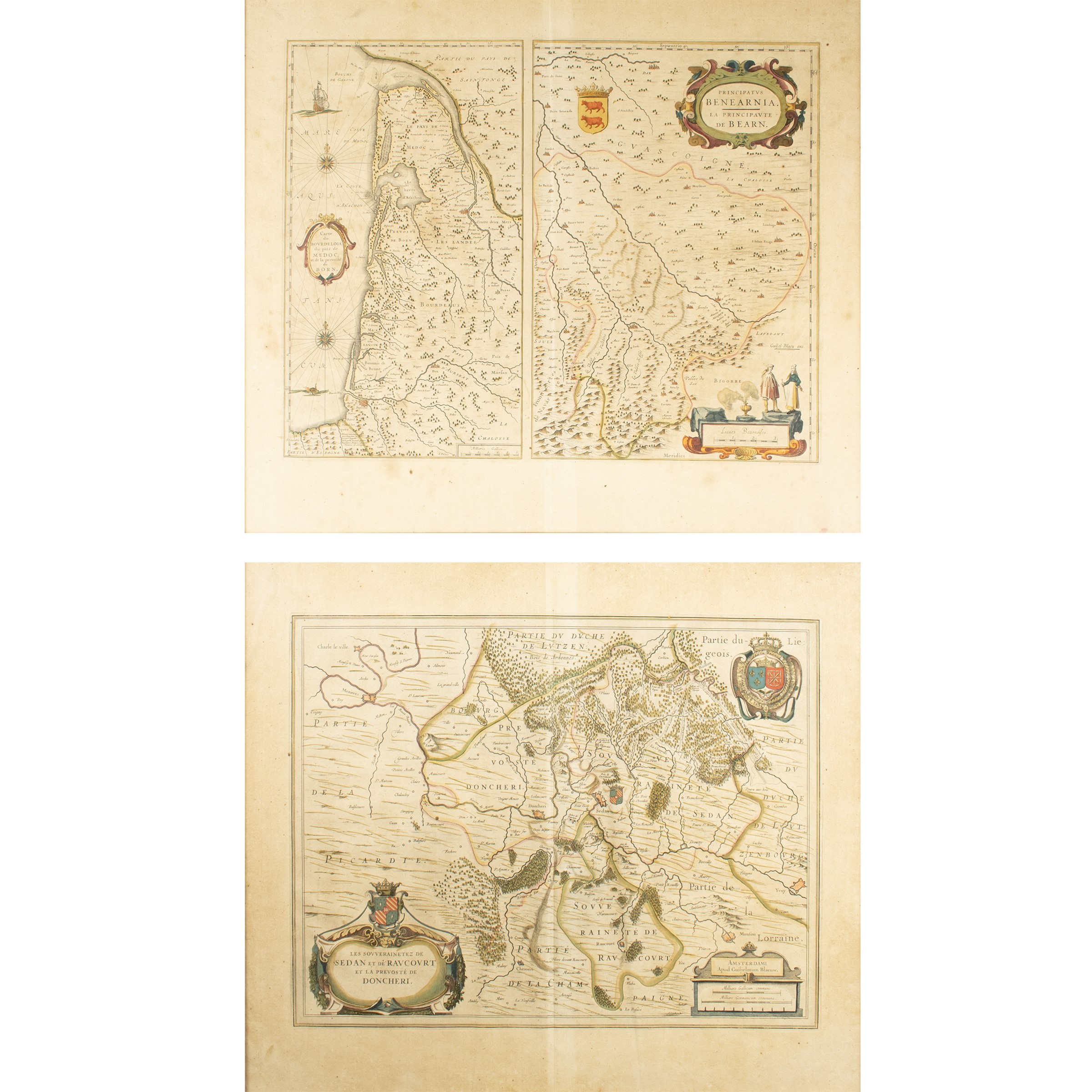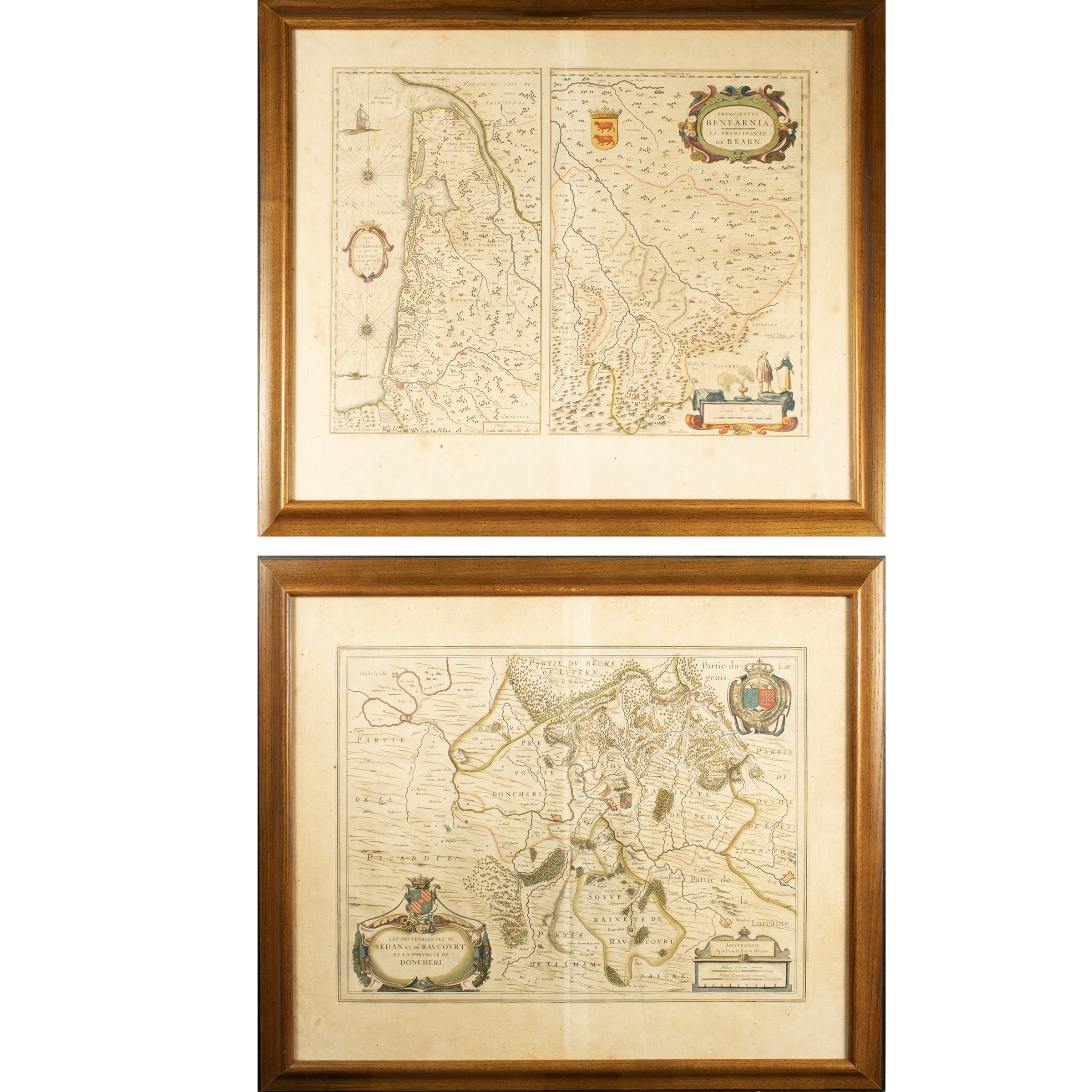 50x60 cm."Carte du Bourdelois, du pais de Medoc, et de la prevosté de Born - Les Souverainetez de Sedan et Raucourt et la Prevosté de Doncheri", pair of colored watercolor engravings, circa 1640, within frames