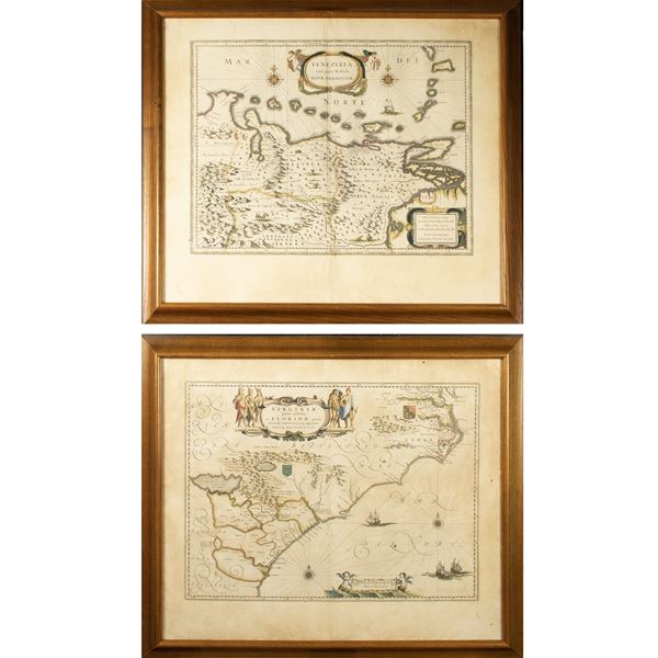 50x60 cm."Virginiae partis australis et Floridae partis orientalis, interjacentium regionum nova descriptio - Venezuela, cum parte Australi Novae Andalusia", pair of colored watercolor engravings, circa 1640, framed