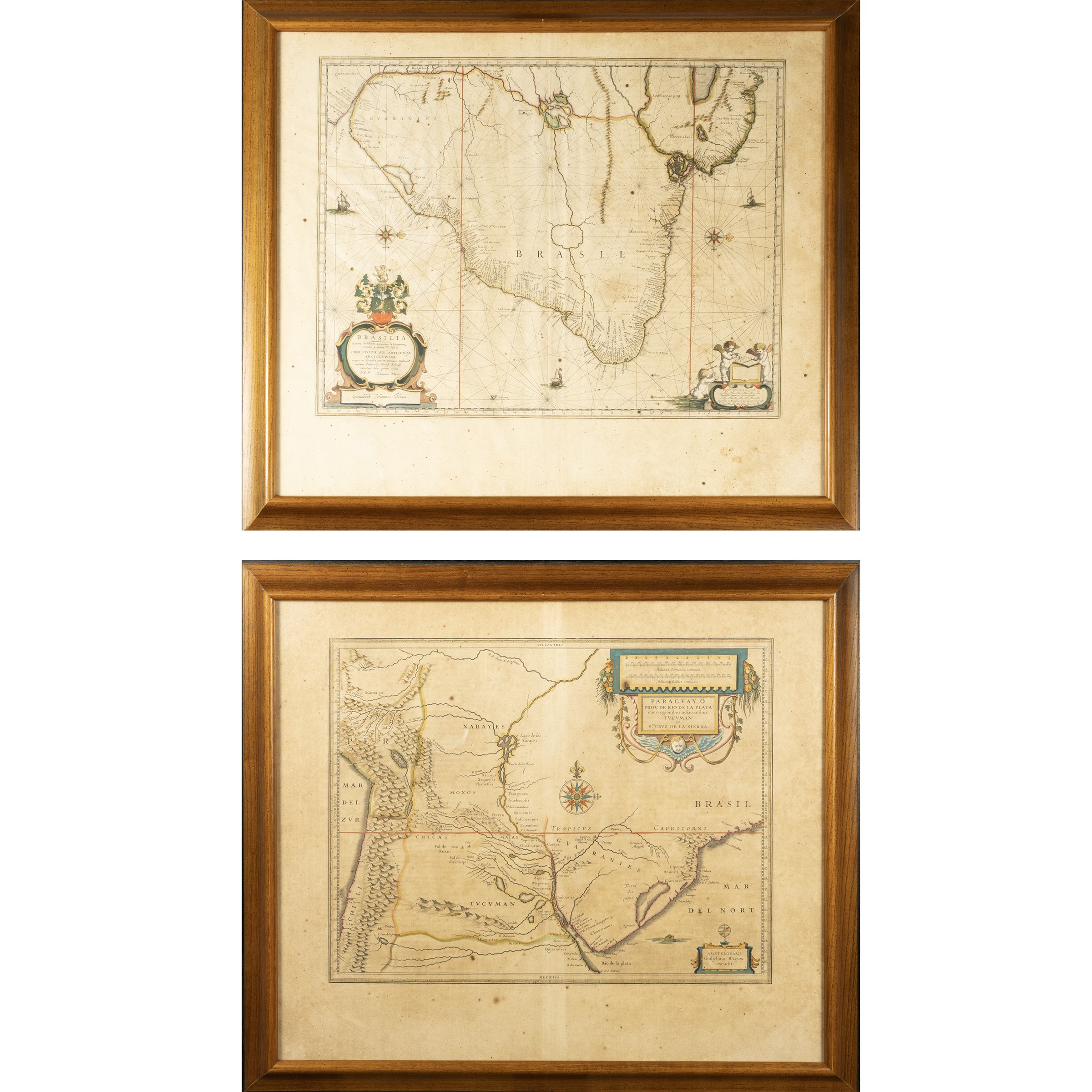 50x60 cm."Paraguay, ó Prov. de Rio de la Plata cum regionalibus adjacentbus Tvcvman et Sta. Crvz de la Sierra - Brasilia", pair of colored watercolor engravings, circa 1640, within frames
