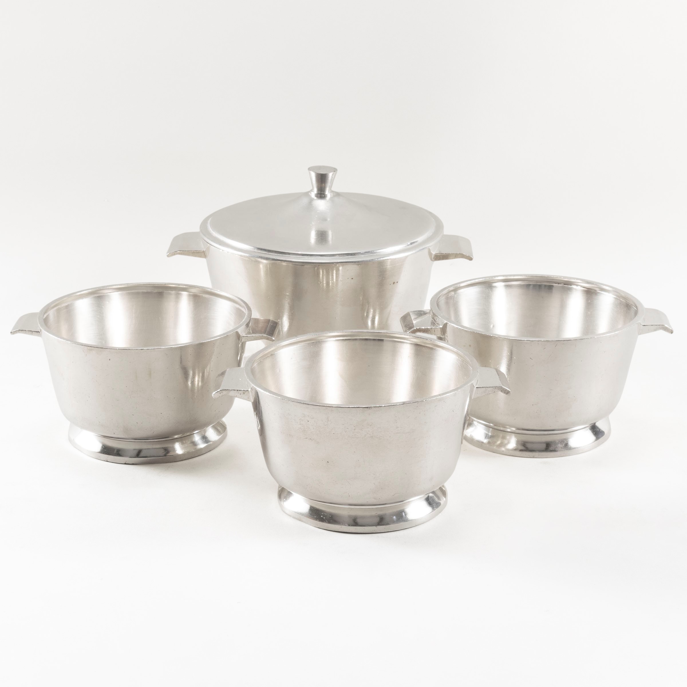 Nickel silver table set, production mark, slight wears and defects, comprising of: four soup tureens: maximum size 15x21.5 cm.