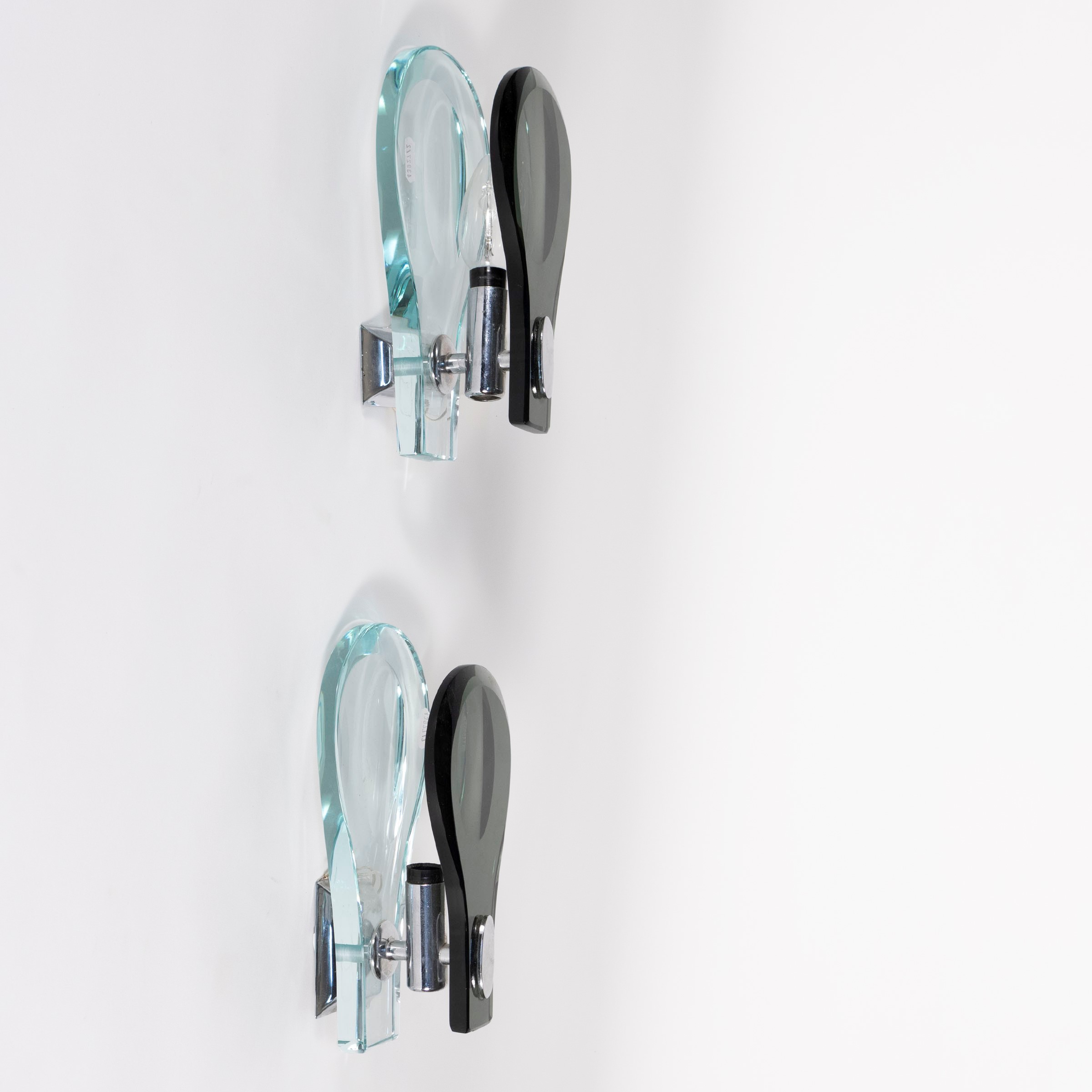 Pair of wall lamps in transparent glass, fumè glass and chromed metal, slight wears