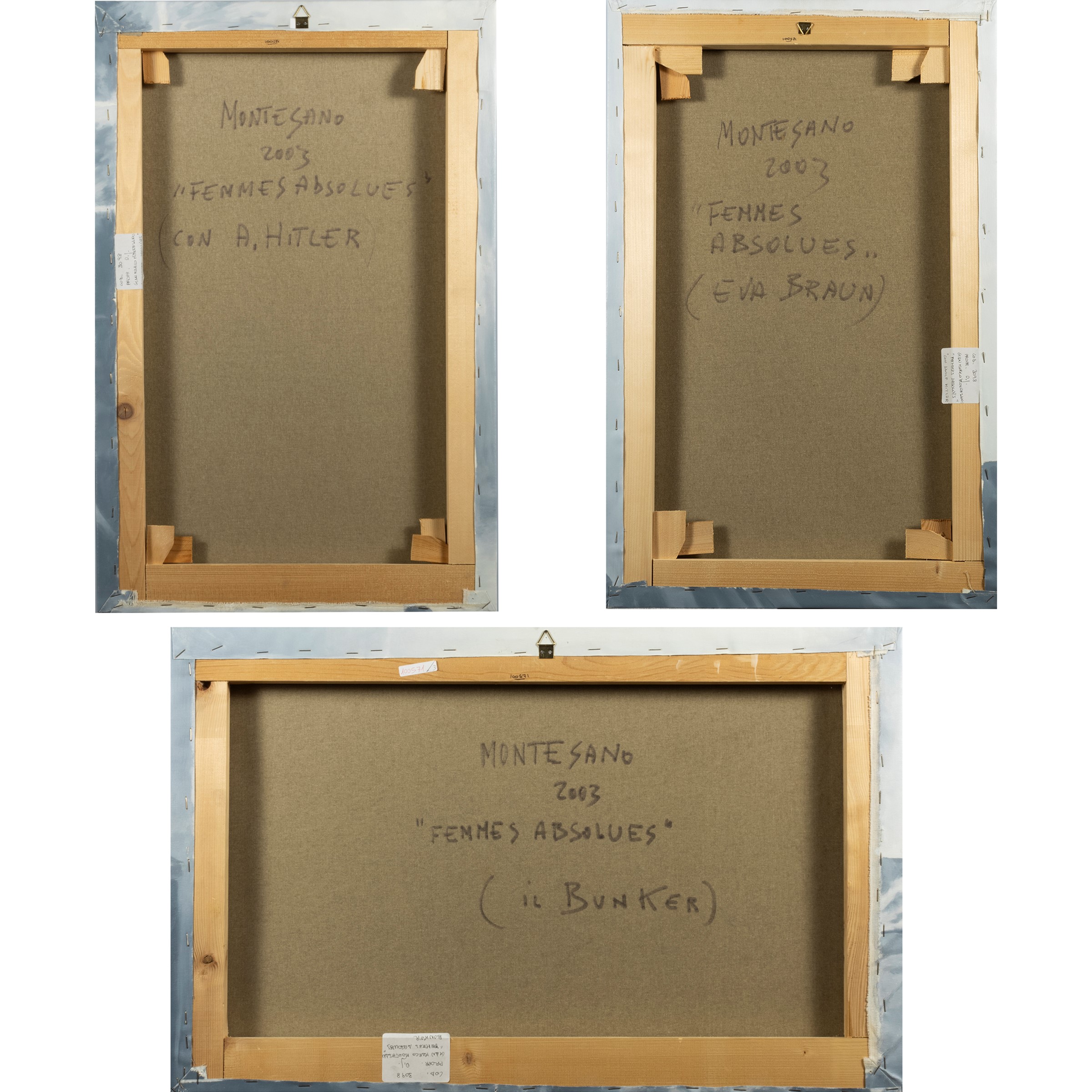 "Eva Braun", "with A. Hitler" and "the Bunker", oil on canvas, signed, dated and titled on the back Authentication on photograph of the Artist for each work Publications: S. Barucco, "Gian Marco Montesano. Femmes Absolues", catalogo della mostra, Umberto Di Marino Arte Contemporanea, Napoli, 2003-2004, s.p.