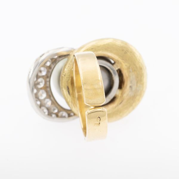 weight 24 gr.brilliant cut diamonds circa 0.60 ct, pearl circa 14 mm. , size 15, open stem