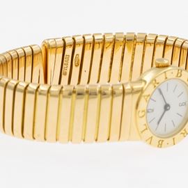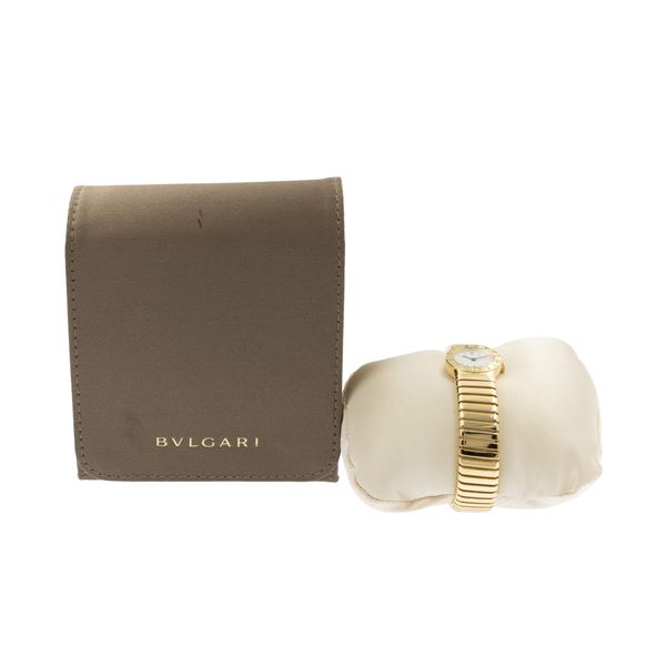 weight 61 gr.in 18kt yellow gold, ref. A5007 - 1840, 19 mm case. white dial with indexes and Arabic numerals, mechanical movement with manual winding, Eberhard 13 caliber, 18kt yellow gold tubogas bracelet, diameter 5.5 cm. complete with fabric case, signed case, dial and movement