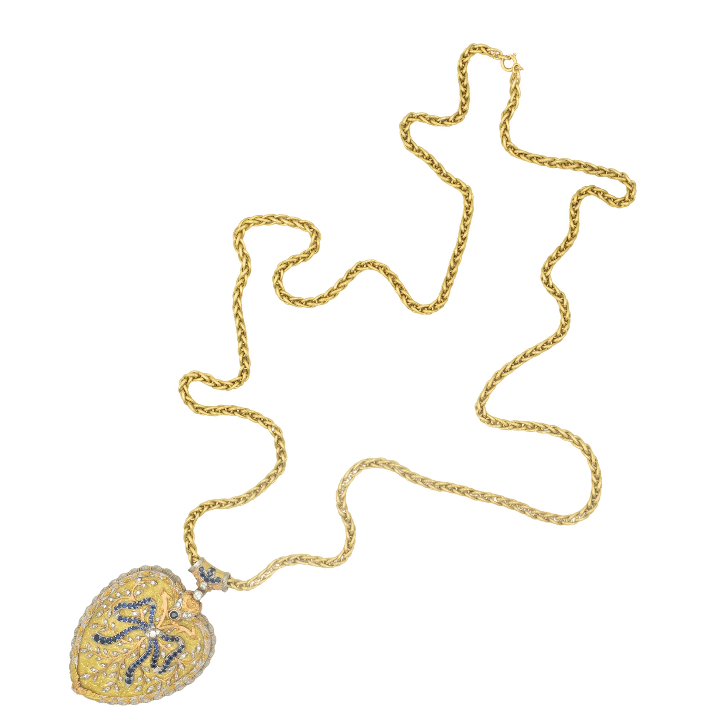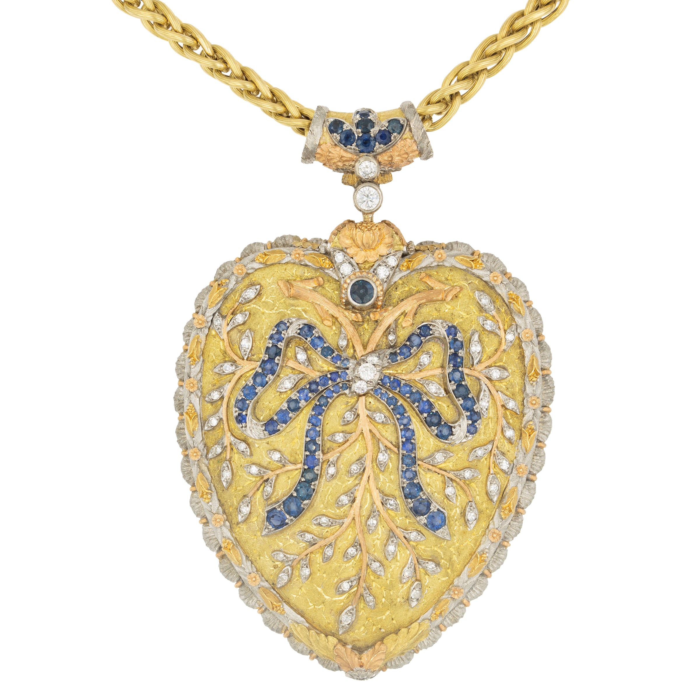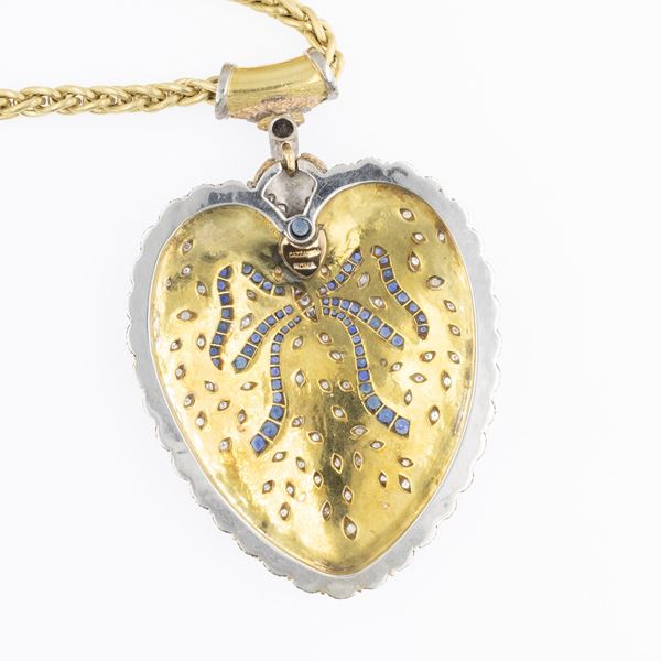 weight 137 gr.round sapphires and brilliant cut diamonds circa 1.20 ct, dimensions 7x6 cm. complete with long 18kt yellow gold chain, length 120 cm.