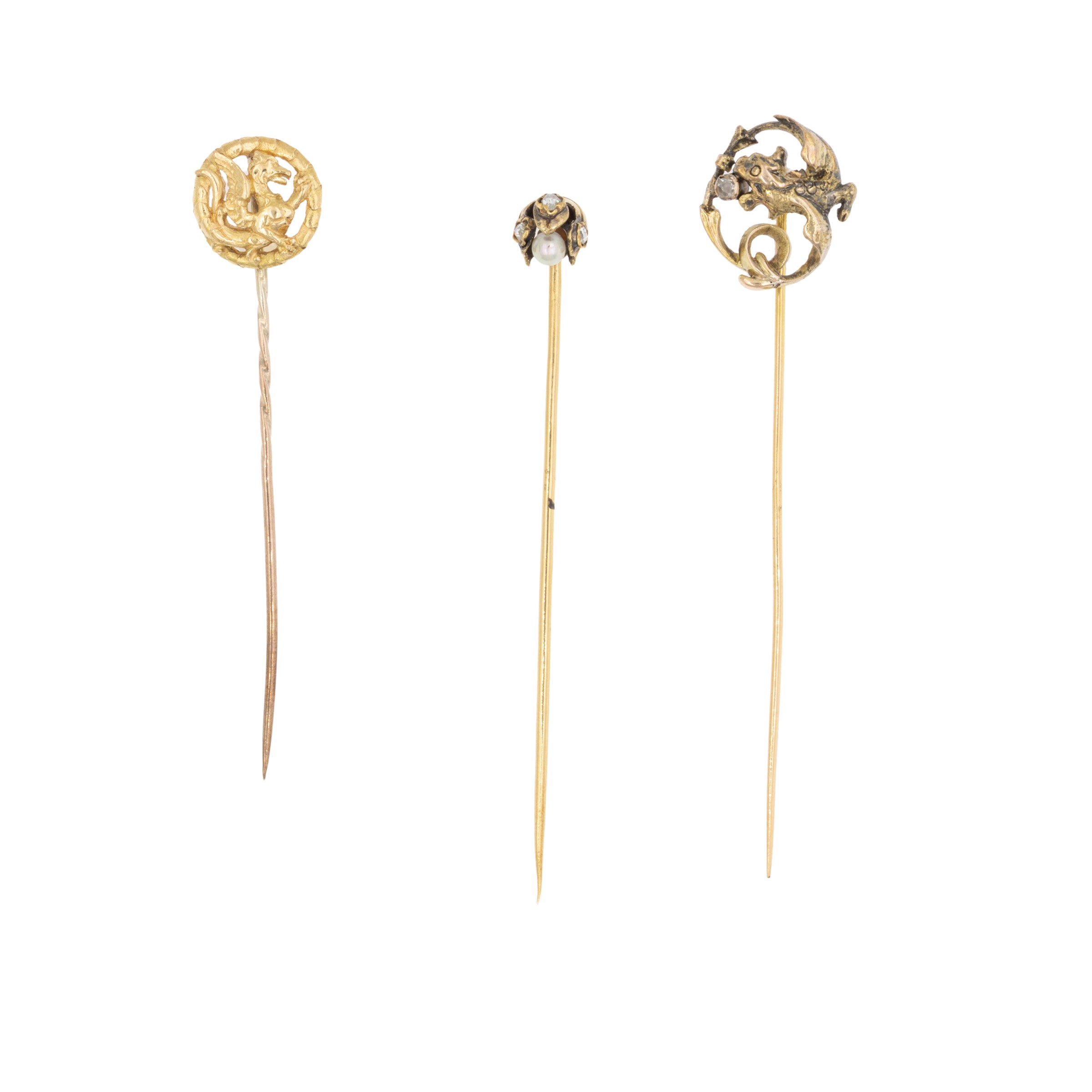 Three antique 18kt yellow gold pins in different shapes and sizes